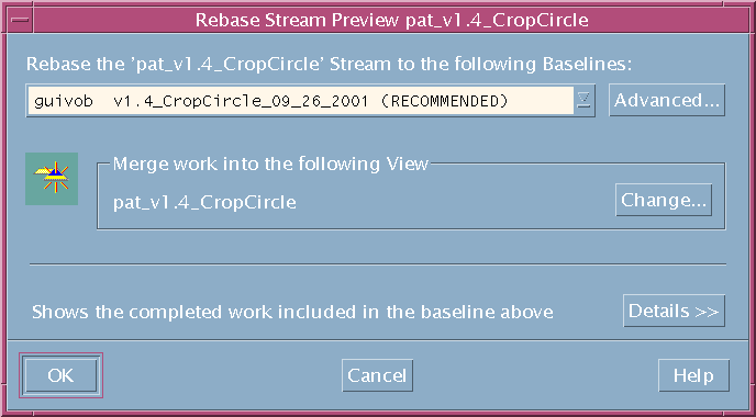 It is important to verify that the dialog box displays your development view under Merge work into the following view. If you attached multiple views to your development stream, use the Change button to choose one view for the rebase operation.