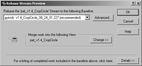 In the HCL VersionVault Windows Explorer, right-click the root directory of the development view and click Rebase Stream to open the Rebase Stream Preview dialog box (see the following figure).