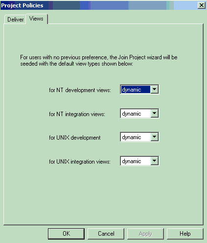 The View tab. On this tab you specify which type of view, dynamic or snapshot, will be created by default the first time your developers join the UCM project using the Join Project Wizard.