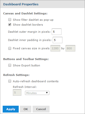 | Fixed canvas size in pixels | Enter the desired width and height of the dashboard to be displayed instead of dynamically resizing based on the browser window. |