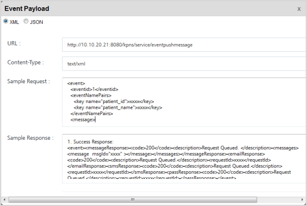 Based on the client requirement arbitrary key/value pairs (metadata) are passed. For example, the two Name_Value pairs patient_name and patient_id configured in the Event Message Box as shown below are included in the