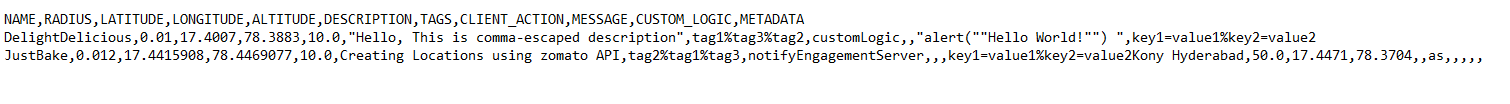 The Import Bulk Geolocation API uploads large batches of individual geolocations included in a .CSV format. Once the .CSV file is uploaded successfully, the geolocations are queued into the Volt MX Foundry Engagement Services.
