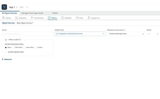 Select the Offline enabled check box. Upon selecting this check box, options to set [Conflict Resolution Policy]](../../../Foundry/offline_objects_user_guide/Content/Conflict_Resolution.md) and [Enable Upload Cache](../../../Foundry/offline_objects_user_guide/Content/Upload_Cache.md) are enabled.
