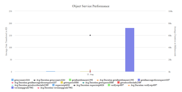 The following Object Service Performance report is the combination of a bar chart and a line chart with Average Data Transferred in KB whose scale is on the left side of the Y-axis and Average Duration in Milliseconds whose scale is on the right side of the Y-axis.