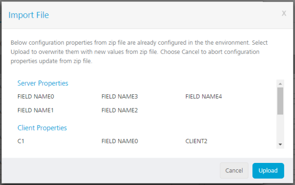 Important: Name the files as serverProperties and clientAppProperties. Each file must contain two columns. Header of the first and second column should be Field Name and Field Value respectively. It is mandatory to follow these naming conventions.