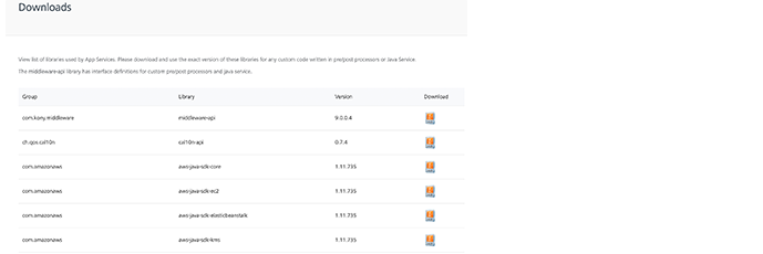 From the Downloads screen, you can view and download the exact version of libraries used in App Services. These libraries can be used in custom code defined for services, for example, Pre-processor, Post-processor or Java Service.
