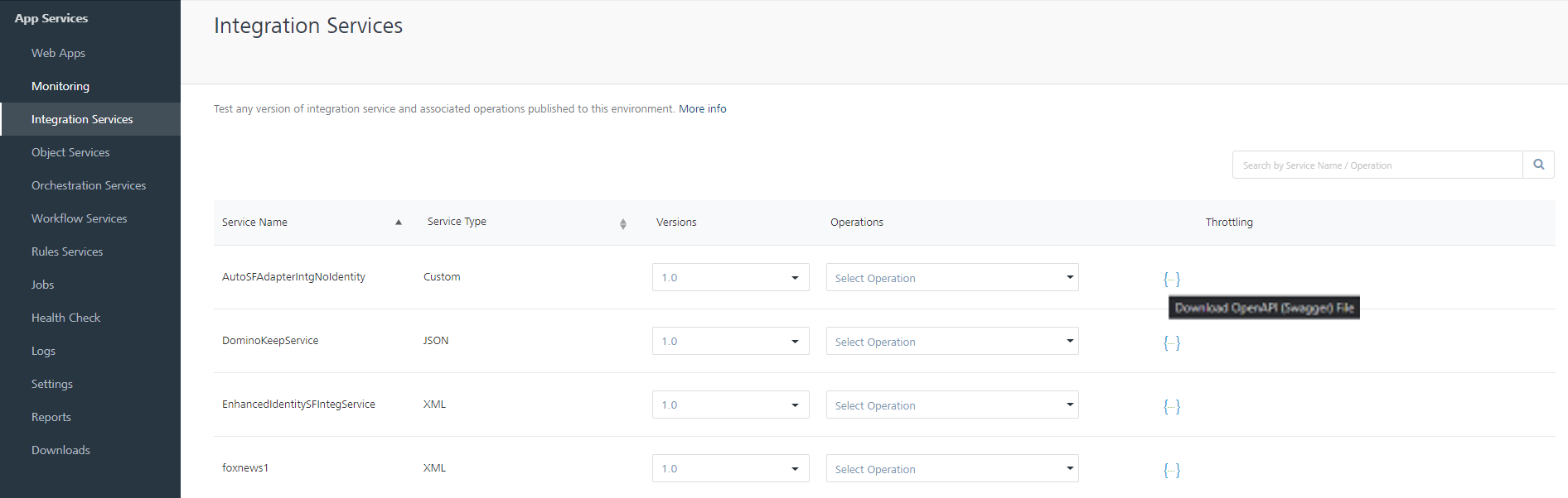 | Documentation | Download the Swagger API file using the download link provided across each service. For more information, refer Downloading a Swagger API file. |