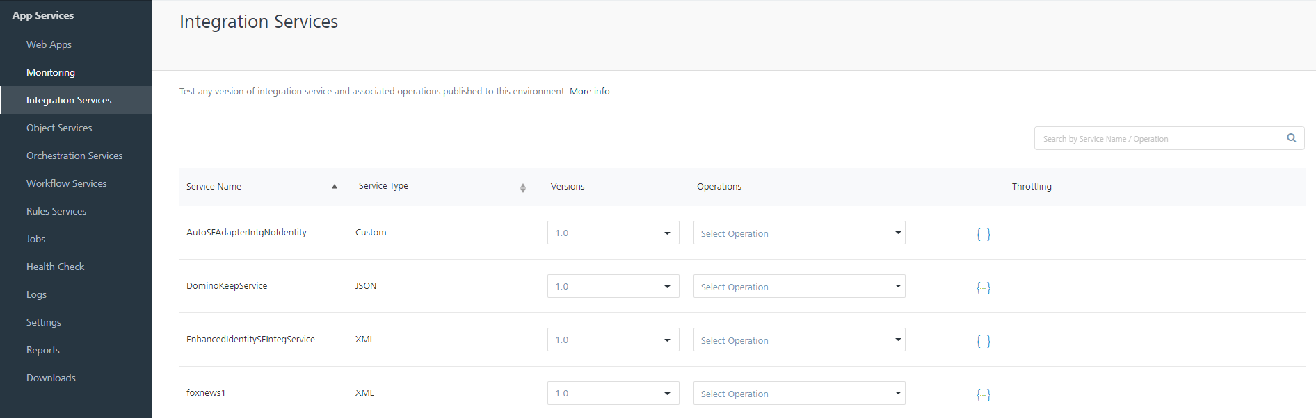 The Integration Services is used to test the service defined with its associated operations. The services defined in the Integration tab and published in Volt MX Foundry Console are displayed in this page. You can test an integration service using different operations available in each service. To know more on integration service, refer Integration.
