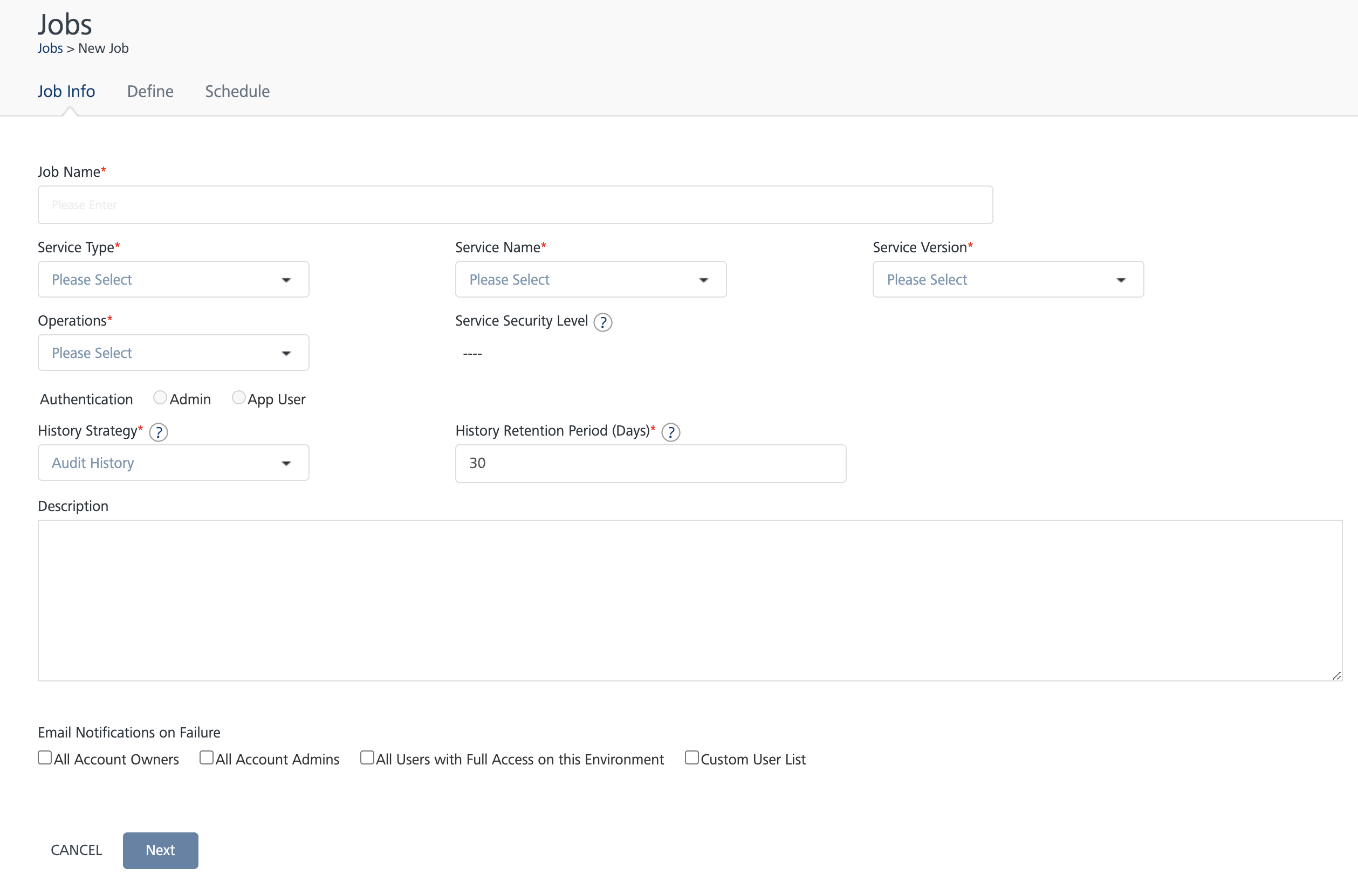 | History Strategy | Displays the following options to view the job history. No History: History will not be tracked. Audit History: The history related to the audits is saved and displayed.> Note: The history of request and response of the job run is not logged. Full History for Failed Runs: The complete history of failed runs is displayed. Full History for All Runs: The complete history of all the runs is displayed. |