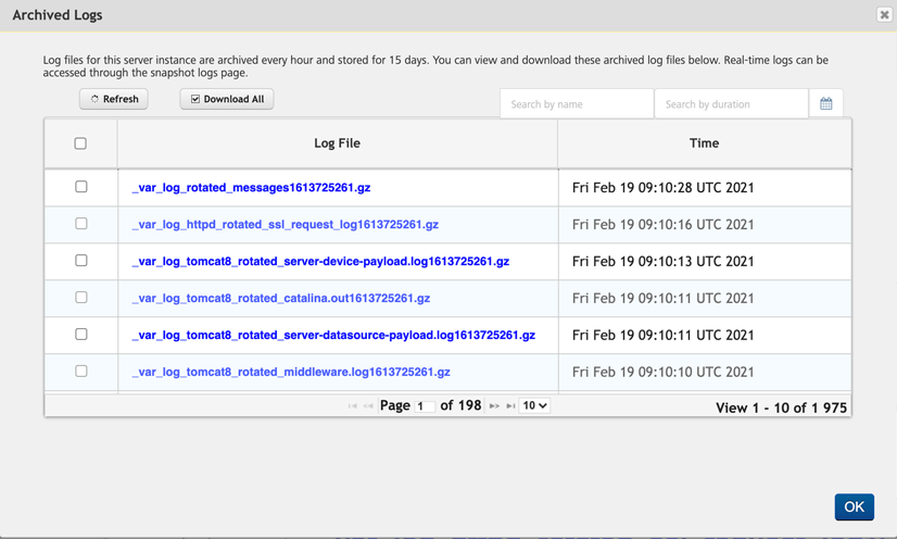 The log files for this server instance are archived every hour and stored for fifteen days. You can view and download these archived log files. If the number of archived log files are more than ten, you can use Next or Previous options.