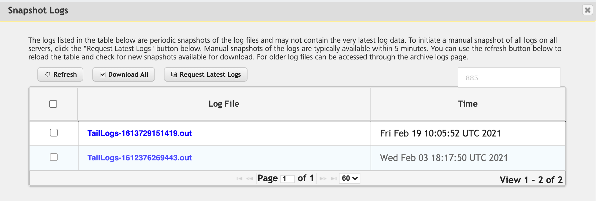 Snapshot Logs include the last manual log snapshot fetched from the server. The logs listed in the table are periodic snapshots of the log files and could not contain the latest log data. You can view and download the snapshot log files. You can initiate manual snapshot of all the logs on all the servers. If the number of snapshot log files are more than 10, you can use Next or Previous options.