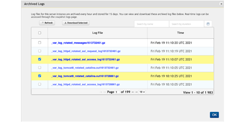 | Download Selected Logs | Select the desired logs and click Download Selected to download the selected logs. For more information, refer Download Selected Snapshot Logs. |