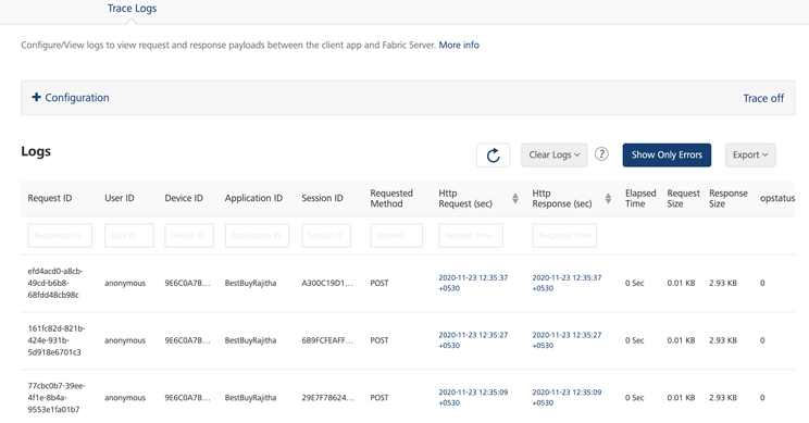 Trace Log feature enables you to view the request and response data between the clients and enterprise datasource server for a particular Application, User, Device, Request and a session.
