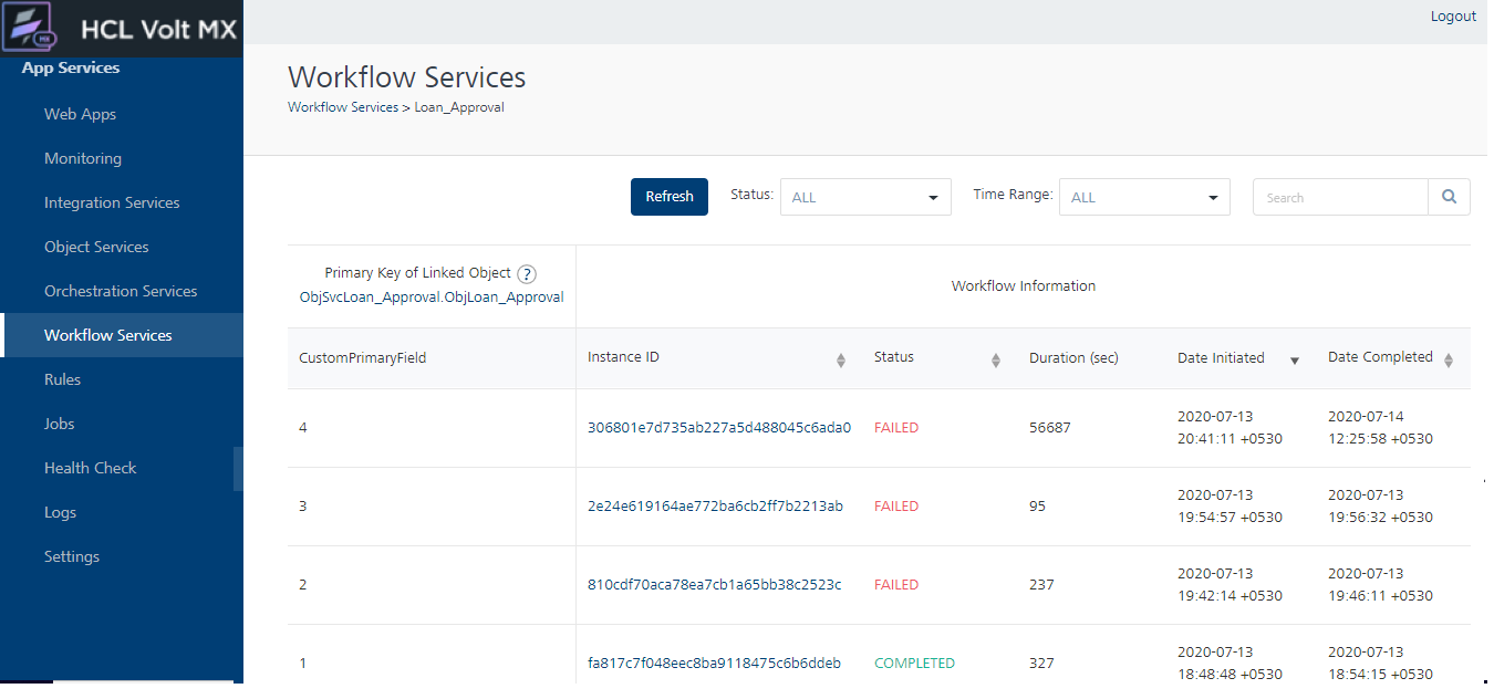 It lists all the Workflow Services that were published to the current environment from Volt MX Foundry Console. You can view all the instances of the Workflow that were triggered from here and the run-time status of each triggered instance from here. To know more about Workflow service, refer Workflow Service.