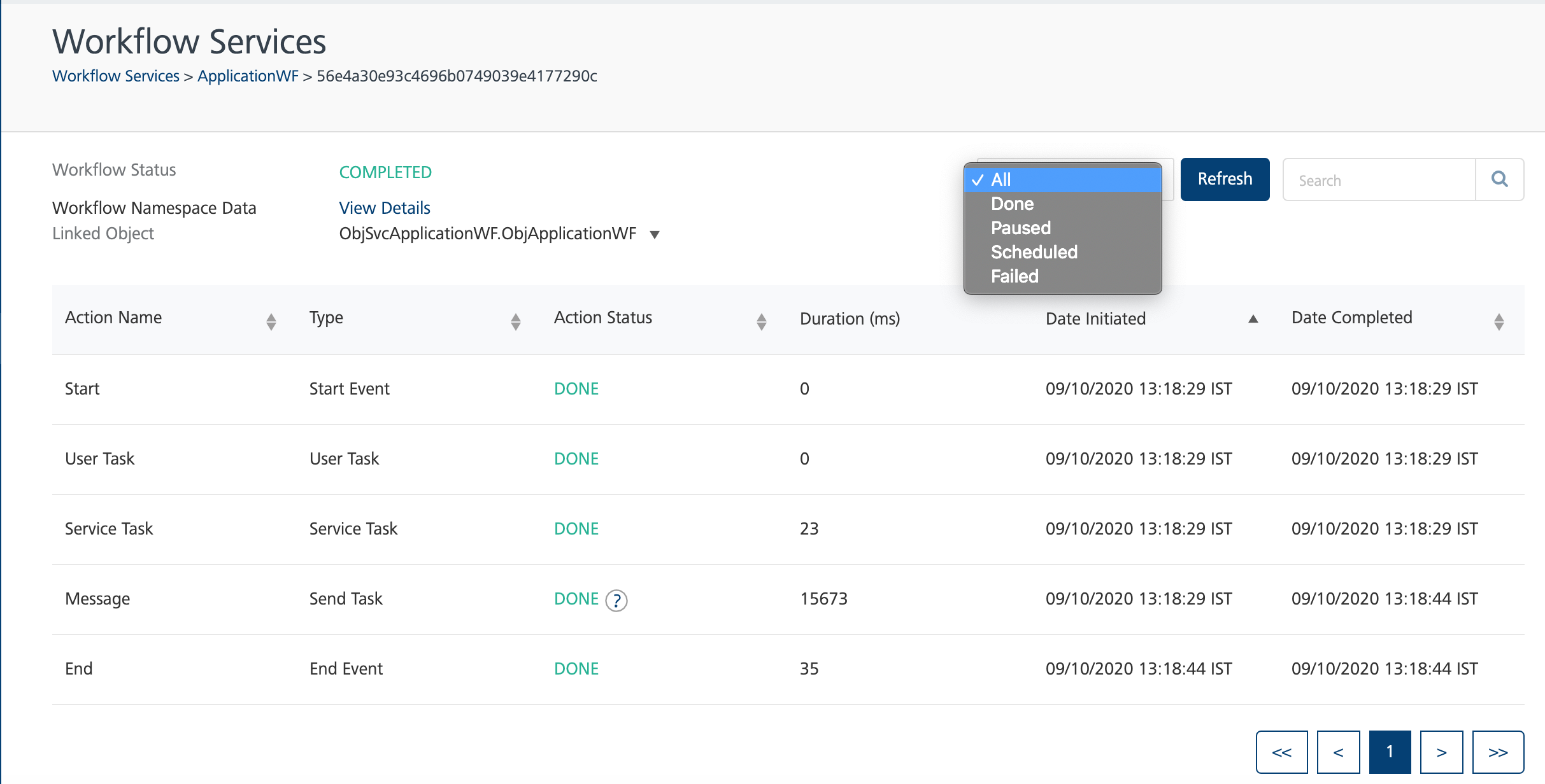 | Action Status | Displays the current status of the node/task, such as Done, Scheduled, Paused, or Failed. Status: Done - when a task/node is completed successfully: Status: Scheduled is applicable only for the Timer node. The status is initially Scheduled until the delay time lapses and then the Timer will again get audited as Done when the Timer node is completed successfully: Status: Paused - when a task/node is waiting for a user action, for example, User Task. Status: Failed - when a task/node did not execute successfully. Clicking on the Failed link displays the error information in a pop-up window. When any task fails, an exception is logged in the middleware.log includes the wfName and wfInstID parameters. These parameters help you to debug the issues that caused for the task failure. For example, when service task is failed, this is one exception being logged in logs. Sample middleware log of a Failed workflow service task:[app.services][ERROR][2020-05-26T21:01:50.360+05:30]:[9eee071d-15f4-4e1a-9aa1-d7de8cb0507d]:[]:[TENANTENVID=4efd7c61-6c83-4ede-b8f7-85db87d6a2a3,svc=AccountOpenService,op=Account,wfName=loopWf,wfInstID=f3478ab0b150a2f5fa60c037328c8f15]:[VOLTMX-SERVER-EVENTS-CONSUMER-THREAD-POOL-1]:[com.voltmx.rules.exception.RulesException:<init>:32]:MW30002: ScriptException - Property access failed in MVEL script causing exception [Error: could not access property: response; parent is null: FOUNDRY_WORKFLOW_CONTEXT..] [Near : {... FOUNDRY_WORKFLOW_CONTEXT.. ....}] ^ [Line: 1, Column: 1]. org.mvel2.PropertyAccessException: [Error: could not access property: response; parent is null: FOUNDRY_WORKFLOW_CONTEXT..] [Near : {... FOUNDRY_WORKFLOW_CONTEXT.. ....}] ^ [Line: 1, Column: 1] at org.mvel2.optimizers.impl.refl.ReflectiveAccessorOptimizer.optimizeSetAccessor(ReflectiveAccessorOptimizer.java:200) ~[mvel2-2.4.3.Final.jar:?] at org.mvel2.optimizers.dynamic.DynamicOptimizer.optimizeSetAccessor(DynamicOptimizer.java:95) ~[mvel2-2.4.3.Final.jar:?] at org.mvel2.compiler.CompiledAccExpression.setValue(CompiledAccExpression.java:54) ~[mvel2-2.4.3.Final.jar:?] at org.mvel2.ast.DeepAssignmentNode.getReducedValueAccelerated(DeepAssignmentNode.java:90) ~[mvel2-2.4.3.Final.jar:?] at org.mvel2.MVELRuntime.execute(MVELRuntime.java:85) ~[mvel2-2.4.3.Final.jar:?] at org.mvel2.compiler.CompiledExpression.getDirectValue(CompiledExpression.java:123) ~[mvel2-2.4.3.Final.jar:?] at org.mvel2.compiler.CompiledExpression.getValue(CompiledExpression.java:119) ~[mvel2-2.4.3.Final.jar:?] at org.mvel2.compiler.CompiledExpression.getValue(CompiledExpression.java:113) ~[mvel2-2.4.3.Final.jar:?] at org.mvel2.MVEL.executeExpression(MVEL.java:941) ~[mvel2-2.4.3.Final.jar:?] at com.voltmx.rules.mvel.handlers.MVELExecutor.execute(MVELExecutor.java:26) ~[middleware-rules-1.0.0.0.jar:?] at com.voltmx.component.service.ServiceInvocationComponent.executeScript(ServiceInvocationComponent.java:150)For more information to download middleware logs, refer to Standard Logs > Cloud Logs > Archived Logs |