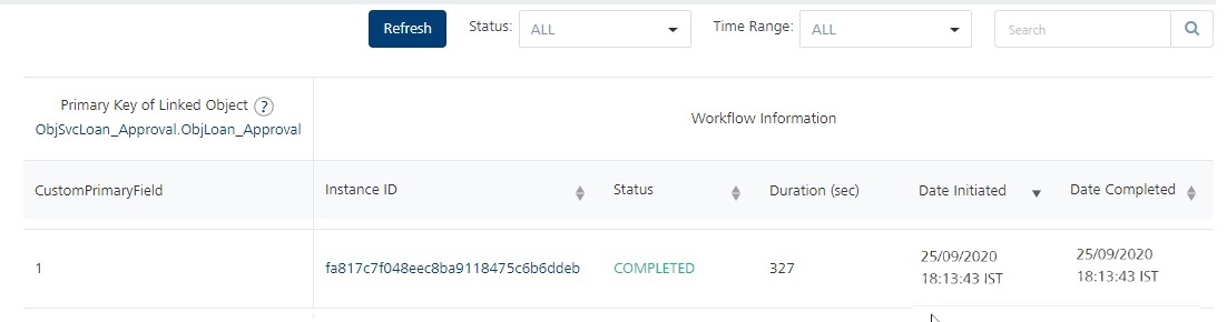 To view all the instances of a Workflow, click on the required Workflow. The Workflow Instance list screen appears.