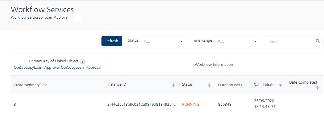 Correlation ID: Displays the value of the Correlation ID field(s) for each instance of the workflow service. This is for Event Triggered Workflows.