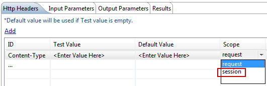 In the Service Definition editor -> Http Headers tab, under Id, declare Content-Type as header type and under Session, select session from the drop-down list as shown: