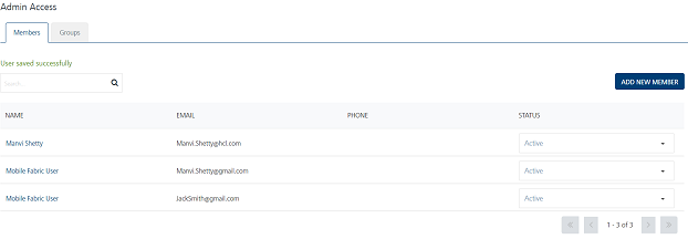 From the Settings section, click Admin Access from the left panel. The Admin Access page appears with two tabs: Members and Groups. By default the Members tab is set to active.