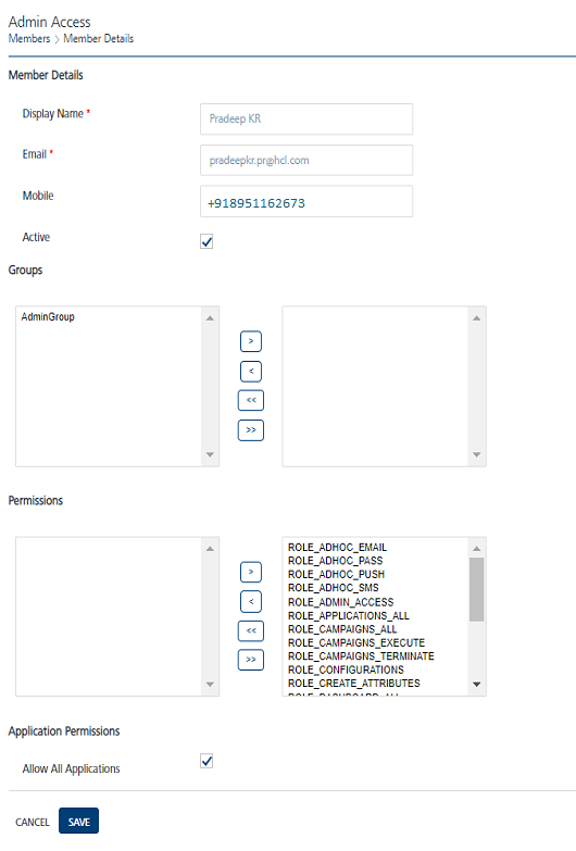 Member Element Description Modification Allowed Display Name The displayed name of a member. Yes Email The email ID of a member. Yes Mobile The mobile number of a member. Yes Active By default the member status is set to active. You can deselect the checkbox to make the member status as inactive. Yes Group The group to which the member belongs. Based on requirement you can assign or unassaign a member to a group. Yes Permissions The assigned permissions to perform tasks. Based on requirement you can assign or unassaign permissions to a member. Yes -