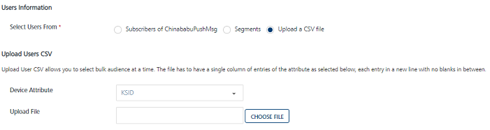 The Upload User CSV option allows you to select bulk audience at a time. The CSV file needs to have a single column of entries of the attribute. Each entry should be in a new line with no space in between.