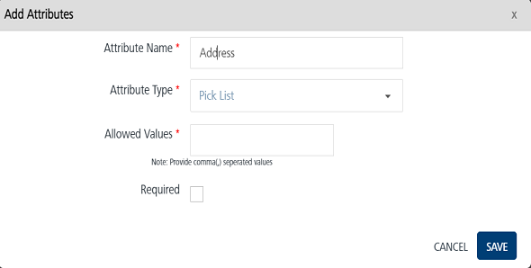 Pick List: If you have selected attribute type as the Pick List, the Allowed Values text field appears. In the Allowed Values text field, enter the multiple values according to your attribute name, such as Sales, Finance, MIS.