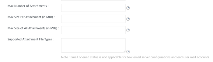 - Max Size Per Attachment (in MBs): This configuration restricts the max size of any attachment in the email. By default, the size of an attachment in the email should not exceed 10MB.
