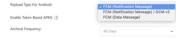 • FCM (Notification Message) / GCM v2: This option is provided for backward compatibility. Currently we support GCM v2 in the Engagement server. If you choose this option, the notification payload is copied into the data payload. This will work like both the FCM (Notification Message) and FCM (Data Message) options as discussed above.