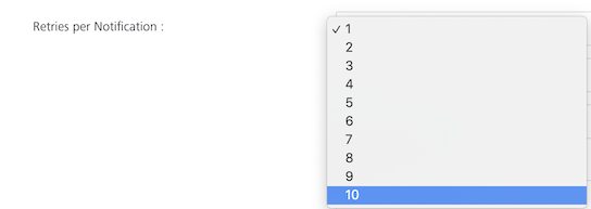 1. Retries per Notification: Select the retries value per notification from the drop-down list. By default, the value is set to ten.