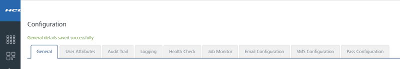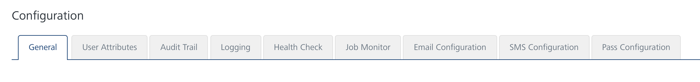 From the Settings section, click Configuration from the left panel. The Configuration page appears with nine tabs including General, User Attributes, Audit Trail, Logging, Health Check, Job Monitor, Email Configuration, SMS Configuration, and Pass Configuration. By default, the General page is set to active.