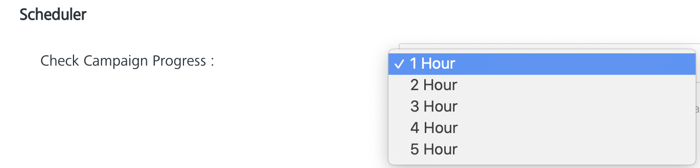 4. Check Campaign Progress: The Check Campaign Progress Scheduler enables scheduling and running campaigns within a particular time frame. The campaign runs at every one hour to send campaign messages to newly added reconciled users. Select the required value from the drop-down list to change the scheduler run time frame.