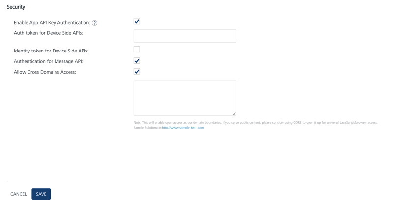 2. Auth Token for Device Side API: The Auth Token when set is applicable for device side APIs only. Enter the auth token in the text field which can be any alphanumeric value such as 1234abc. If the value is set, the security is enabled for the device side APIs and the invoking application needs to pass a header: X-Device-AuthToken with the value as 1234abc.
