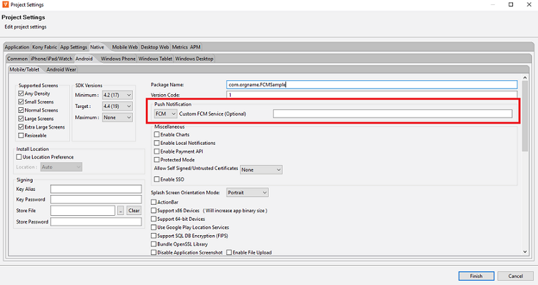 This option is to enable Push Notifications for the application. This option copies the libraries required for push notification into the project during build time.