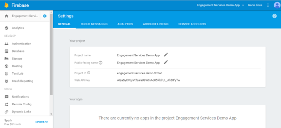 The Settings page appears. Here you can view the Project name, Public facing name. Project ID, and the web API key for your reference.