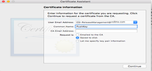 Enter the email address and the common name in the screen below and select the option Saved to disk. Click Continue.