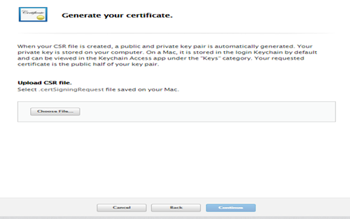 Once it is saved, log on to developer.apple.com with your Developer account (Apple user ID). Click on Choose File.