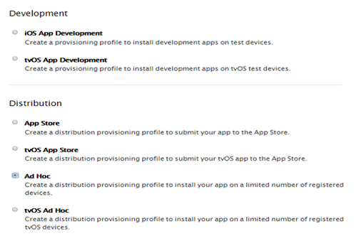 Select the type of the provisioning profile required as per your usecase. Then click continue.