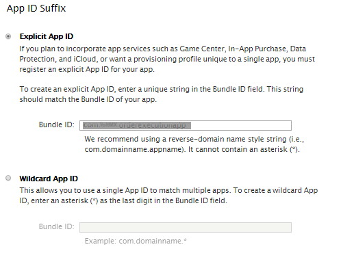 Here you can choose an Explicit App ID, which supports app specific capabilities or a Wildcard App ID, which doesn’t support app specific capabilities. A single Wildcard App ID can be used for different apps.