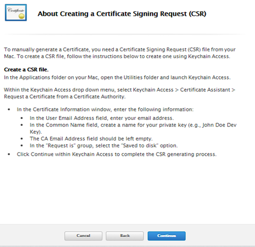 The remaining certificate creation process is the same as described earlier for Push APNS certificate creation.