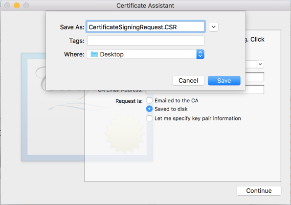 In the screen below, change the file name extension in Save As to CSR. Click Continue.