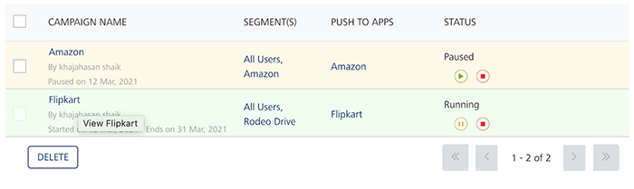 The system displays the confirmation message that the campaign is paused successfully. The color and the status of the paused campaign changes in the list-view.