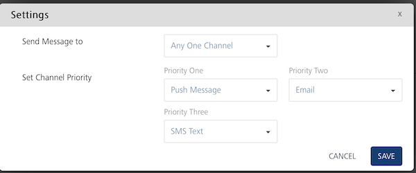 You can set channel priority to send messages to users through the Settings button available on Campaign > Define Message page. The Settings button becomes active when you select at least two channels. There are four options available to send messages to users: push message, email, SMS, and Passbook.
