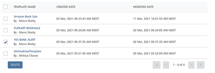 The system displays the confirmation message that the template deleted successfully. The deleted template is no longer displayed in the templates list-view.