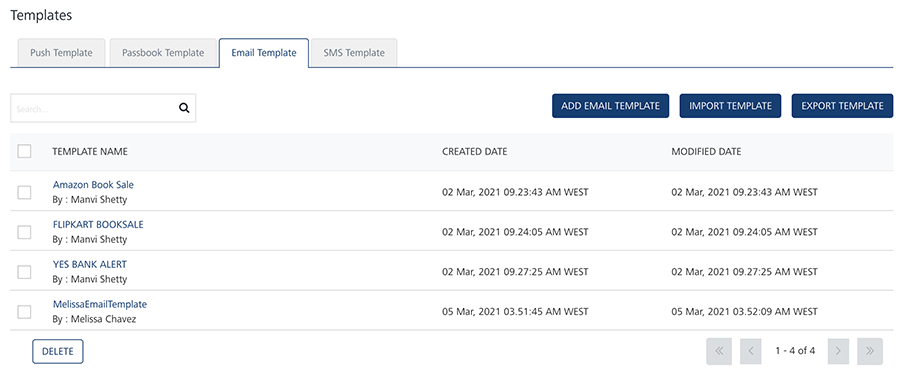 From the Settings section, click Template from the left panel. The Templates page appears with the four tabs including Push Template, Email Template, SMS Template and Passbook Template. Click Email Template to open the Email Template home page.