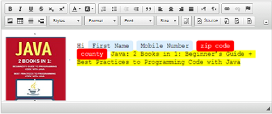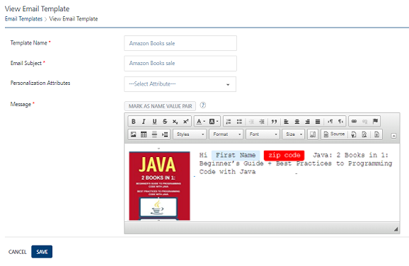 Email Message Template Element Description Modification Allowed Template Name Email message template name Yes Email Subject Email subject text Yes Personalization Attributes There are default personalization attributes: First name, Last name, Email, Mobile number, Country, and State Yes Mark as Name Value Pair A key-value pair is a set of two linked data items: a key, which is a unique identifier for a data type, and its value: the data such as, county:Iowa, state: wisconsin Yes The added details appears in the message box window.