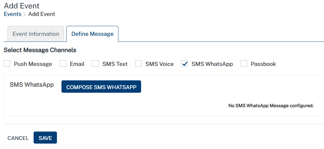 Based on your requirement, select a channel to compose an event message. You need to select at least one channel: push, email, SMS, voice, whatsapp, or pass to send event notifications.