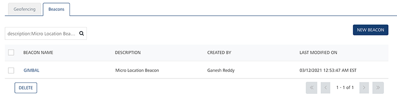 Beacon Element Description Beacon Name The column displays the names of the added beacons Description The column displays the description of the added beacons Created By The column displays the name of the owner who creates the beacons Last Modified on The column displays the date on which the beacon is last modified Display Controls By default, the number range is set to 20, so that only 20 beacons are displayed in the grid. You can view more beacons through the forward arrow icon. You can navigate back through the backward arrow icon. -