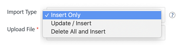 - Update/Insert: The option reads the data in the file and tries to update each record first. If the record update fails, the system inserts the new records.