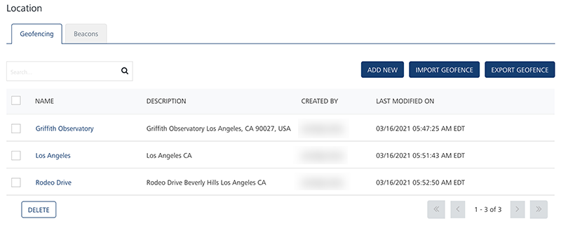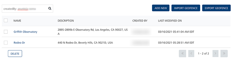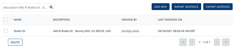 Note: To clear your search result, click in the Search field to view the Geofencing page.