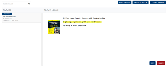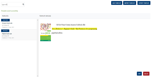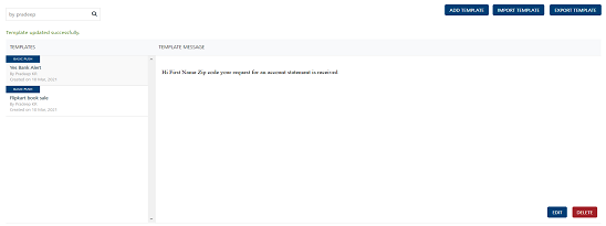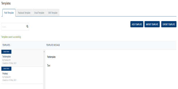 From the Settings section, click Template from the left panel. The Templates page appears with the four tabs including Push Template, Email Template, SMS Template and Passbook Template.By default, the Templates home page displays Push Template tab details.